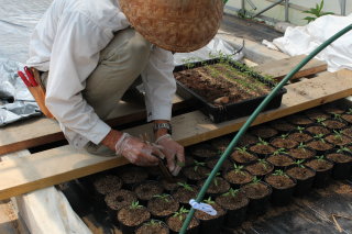 鉢上げ当日は、トレー苗に散水できないことと、お昼の直射日光はきつく即焼けてしまうため遮光は必須。